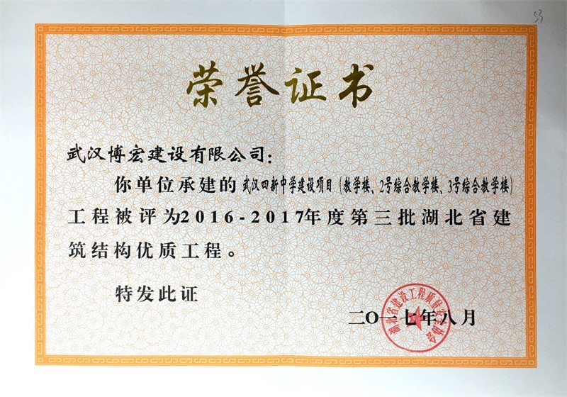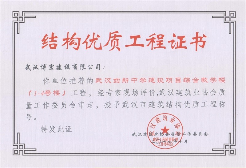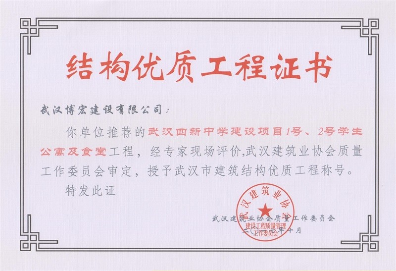 结构优质工程证书(武汉四新中学综合1号、2号学生公寓及食堂楼)