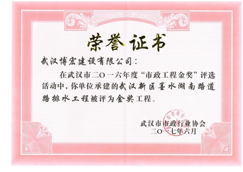 2016年度市政工程金奖(墨水湖南路道路排水工程)