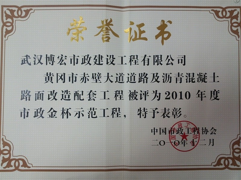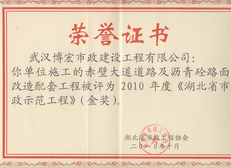2010年度湖北省市政示范工程金奖(赤壁大道道路及沥青砼路面改造配套工程)