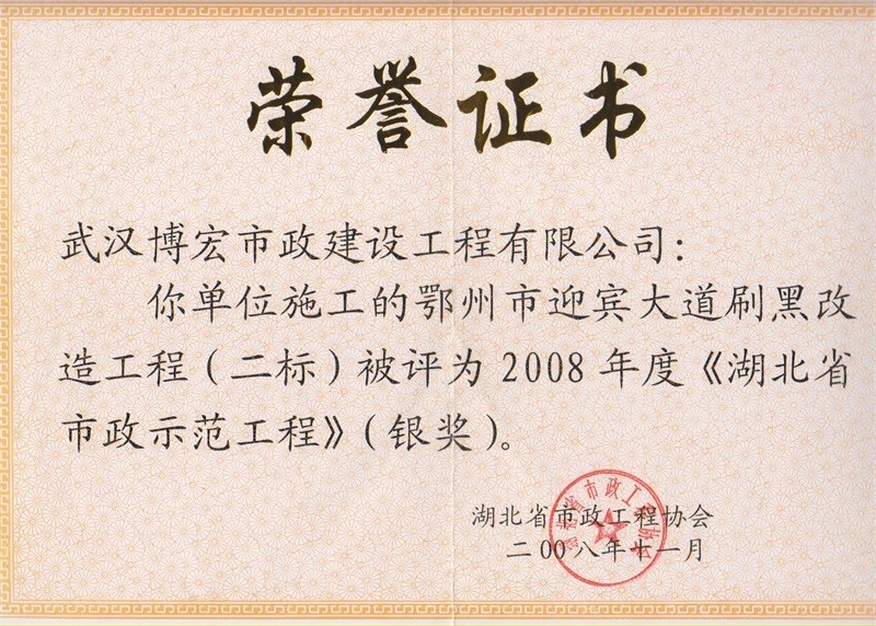 2008年度湖北省市政示范工程银奖(鄂州市迎宾大道刷黑改造工程二标)