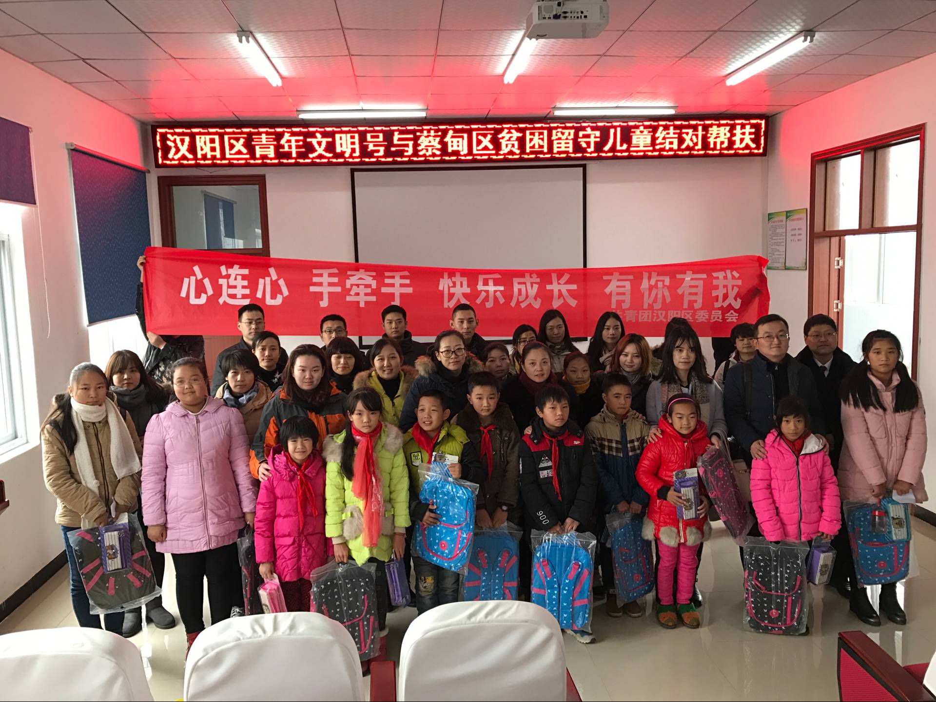 1124日,为认真落实共青团助力脱贫攻坚电视电话会议精神,根据“关爱留守儿童,助力精准扶贫”行动整体安排,汉阳团区委组织全区20个市级以上青年文明号单位赴蔡甸区消泗乡,集中慰问帮扶贫困留守儿童,并进行现场结对,我公司参与了此次慰问帮扶活动。